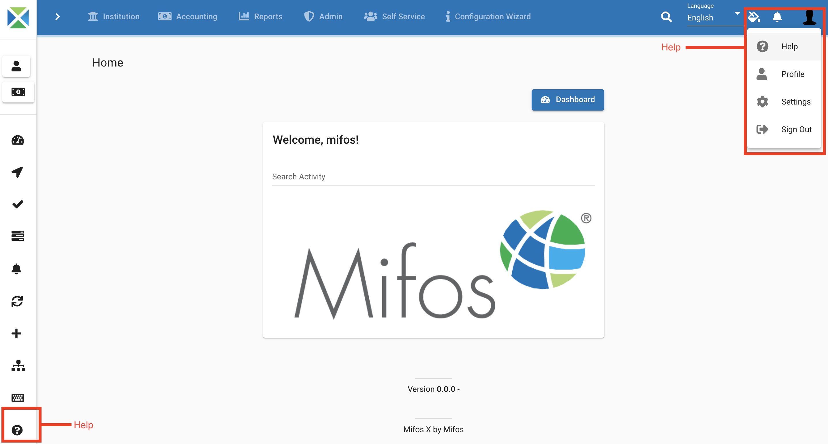 To access additional resources for Mifos X, click on the **Profile icon** button at the top-right corner or on the sidebar click on **question mark** and from the drop-down menu, select **Help.**